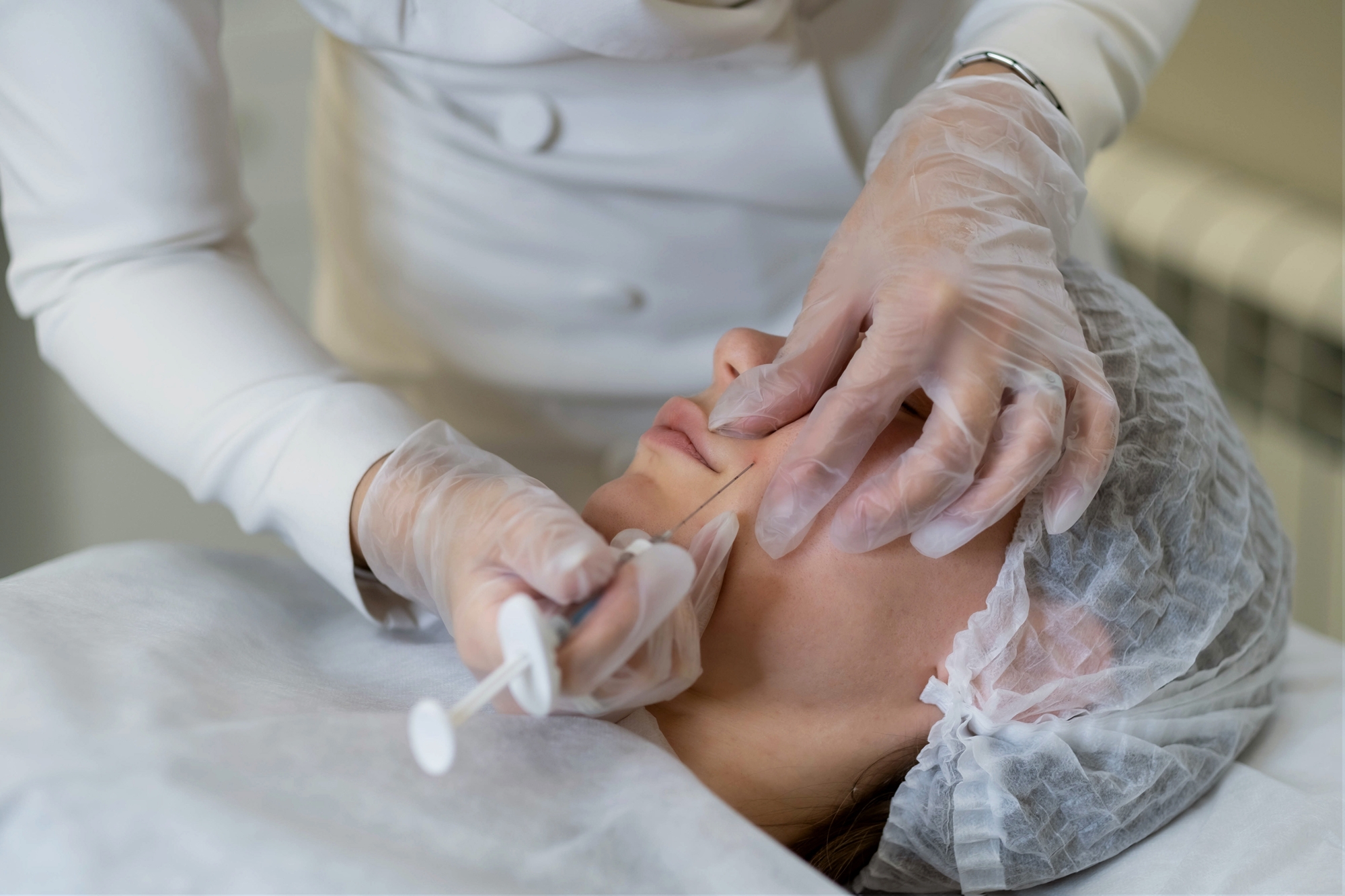 - Cosmetologist administers an injection into the nasolabial fold, targeting signs of aging. Precision in cosmetic treatments is key